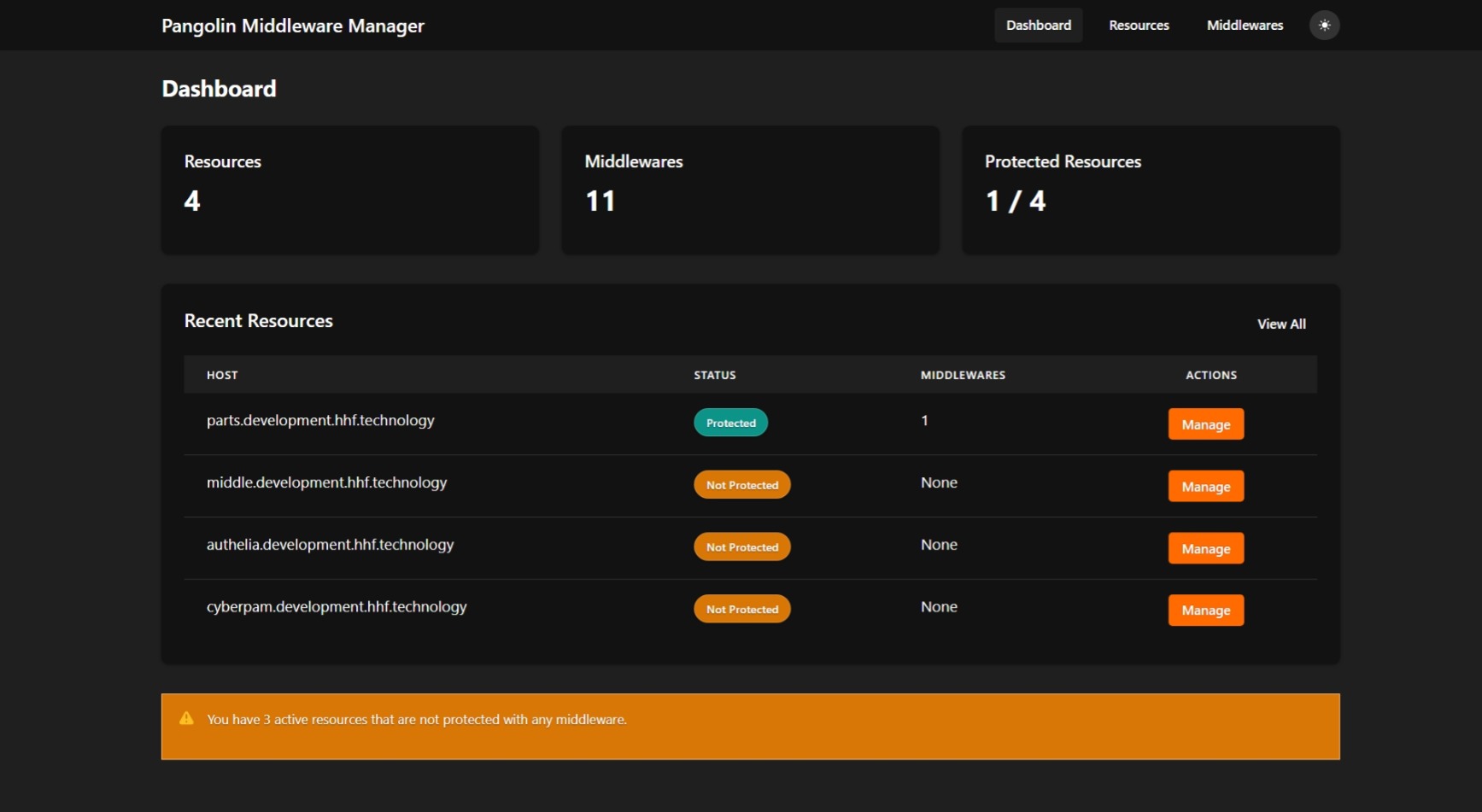 The Middleware Manager monitors resources from your chosen data source (either a Pangolin API or a direct Traefik API connection) and provides a web UI to: