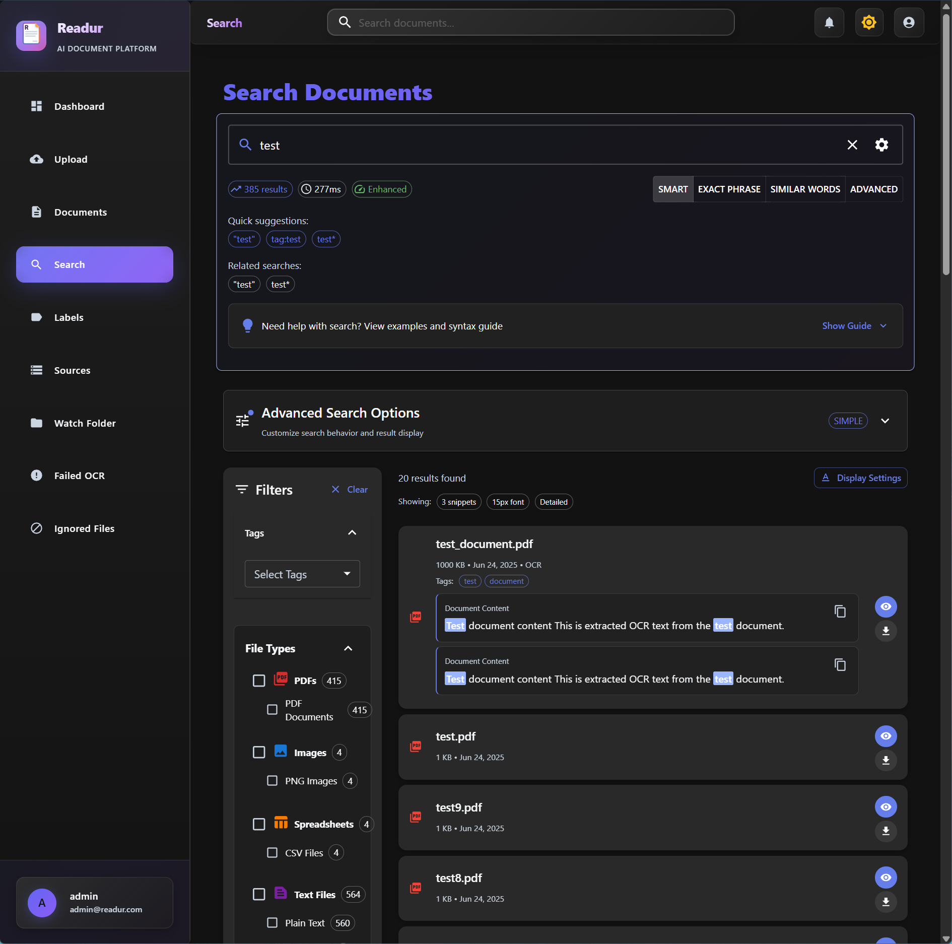 Readur is a powerful and modern document management system designed to help individuals and teams efficiently organize, process, and access their digital documents. It combines a high-performance backend with a sleek and intuitive web interface to deliver a smooth and reliable user experience.